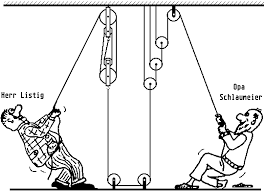 4. Quin és l'avantatge mecànic del sistema de politges de sota? Si volem pujar 50cm quants metres de corda haurem d'estirar? Si el pes de la carrega és de 100N quina força hem de fer per poder pujar la carrega?(dificultat baixa)